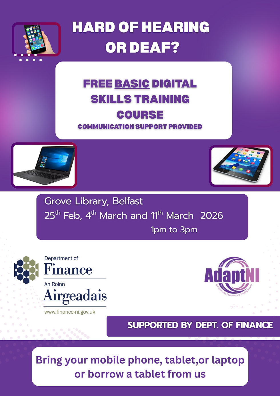 AdaptNI has launched a new accessible Digital Skills training programme for people who are Deaf or have hearing loss. The programme is being delivered in libraries across all council areas in Northern Ireland and is supported by the Department of Finance.